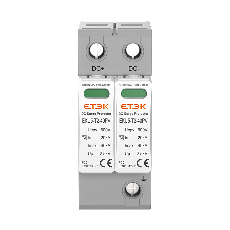 EKU5-T2-40PV is a Class II surge protection device engineered for photovoltaic systems, offering robust DC-side protection compliant with IEC/EN61643-31 standards. Designed for commercial and utility-scale solar installations, this SPD delivers 40kA maximum discharge capacity (8/20μs waveform) with triple-mode protection between DC+/DC- poles and PE ground.